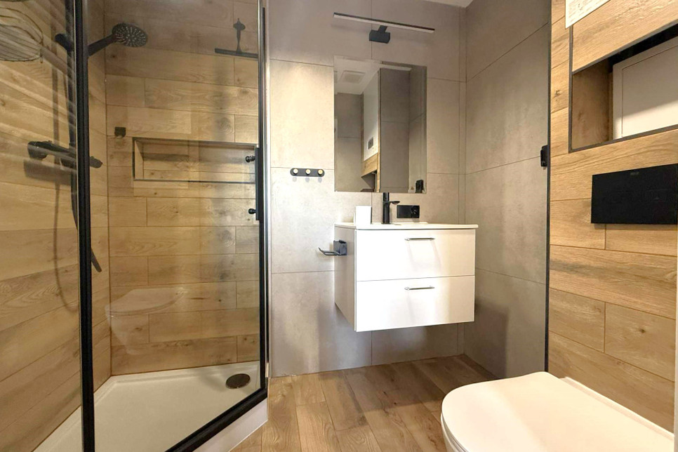 Łazienka po remoncie – prysznic, WC, umywalka.