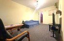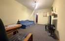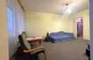 Mały pokój wyposażony w tapczan oraz meble pokojowe, w dużym pokoju fotele oraz ława. W łazience wanna oraz wc.