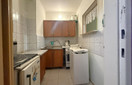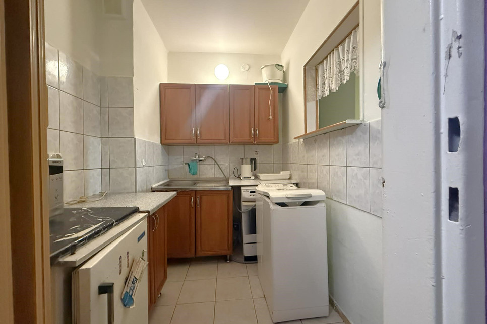 Kuchnia wyposażona w meble oraz kuchenkę elektryczną, mikrofalówkę, w kuchnie znajduje się też pralka.